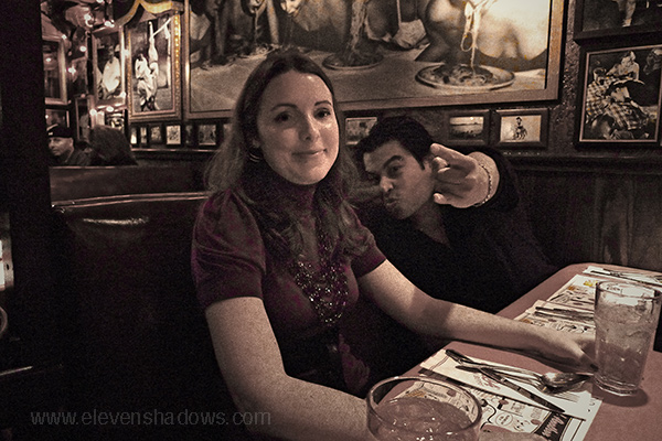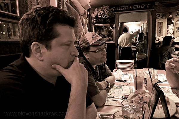 and Gus at Buca di Beppo at the dinner.The monochromatic look that we've switched to here? Purely artistic, I assure you, and has nothing to do with me not being able to figure out how to change the white balance on the little Leica point-and-shoot, oh no. |