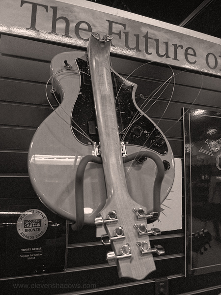 Another view of the Voyage Air Travel Guitar. Was easy to fold away or set up. Strings of course stay on. The guitar sounded fine. Apparently Paul McCartney's guitarist, Brian Ray, uses one, and therefore, you should too. |