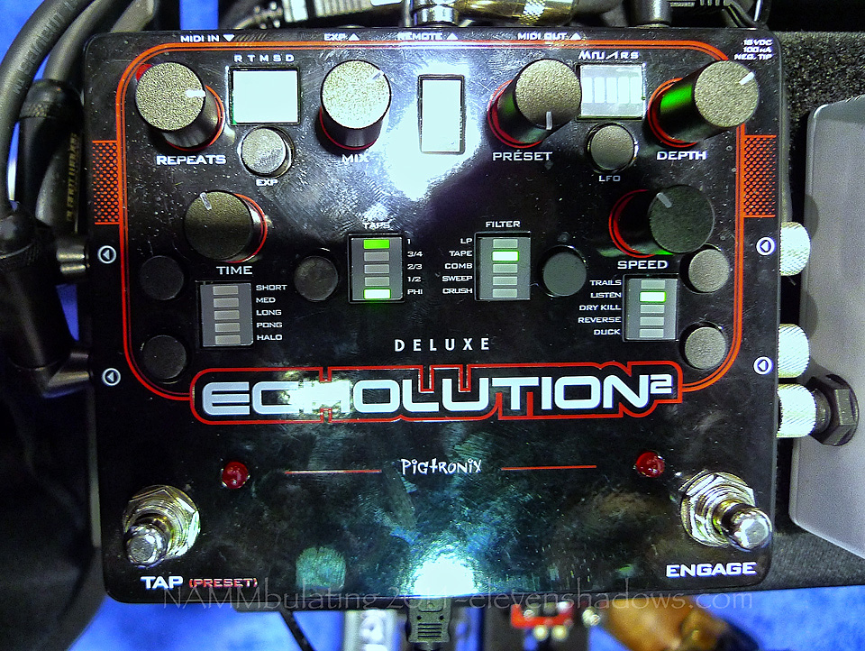 Pigtronix Echolution 2 Deluxe. Pigtronix came out with the Echolution 2 and have discontinued my favorite (by far) analog delay pedal, the Echolution 1. Now they've done away with the rows of switches, replaced by buttons and knobs, which I don't like as much because I'm more into sound design, but I totally get it. Now, the Echolution has presets and far more control than before, and can be edited on computer via USB if one wishes. It still has that same beautiful, spacious, amazing delay, just a thing of beauty. |