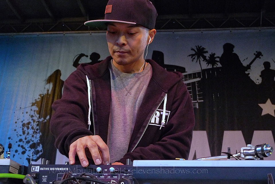 DJ Qbert. Holy crud, this guy is sick, talented beyond description. He was up on the NAMM stage with the Invisible Scratch Pickles and Mixmaster Mike, whom they had run into on the NAMM floor and invited up. |