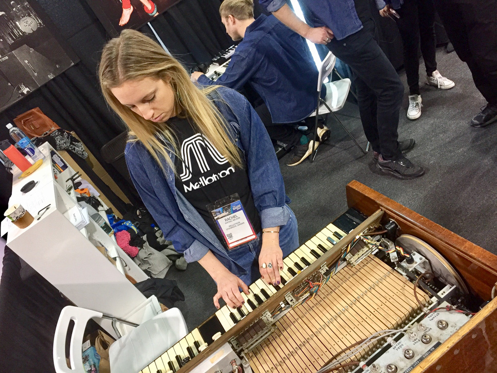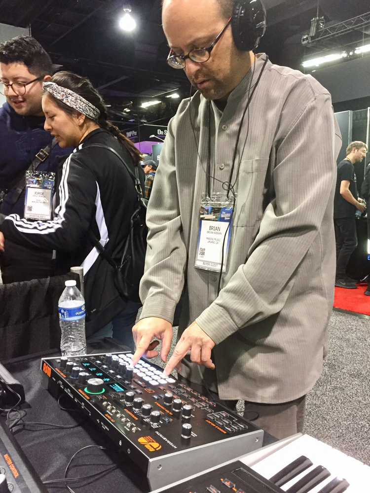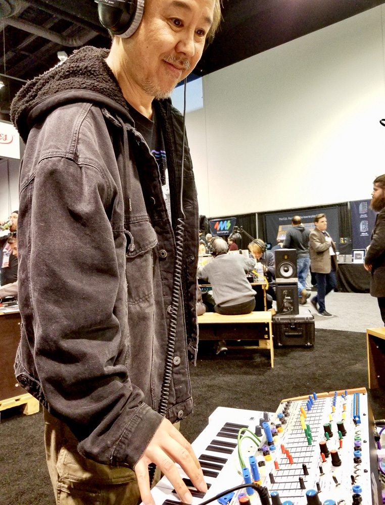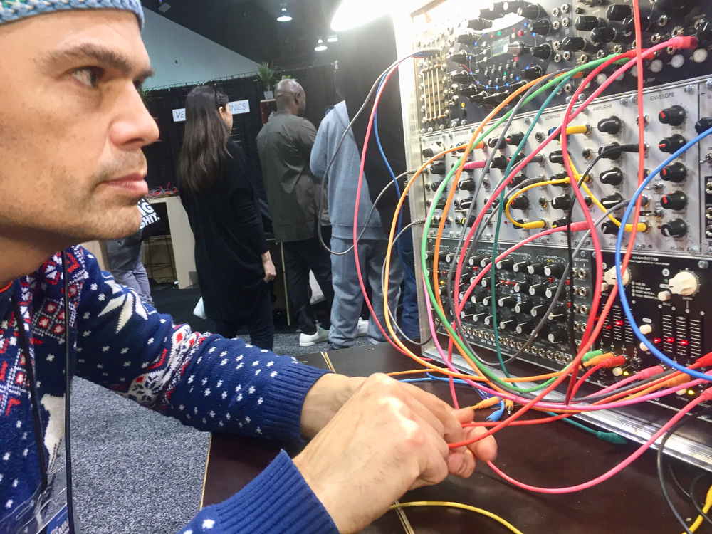 Earlier that day on the NAMM floor, checking out a Buchla. Photo courtesy of Mitch Brown. |