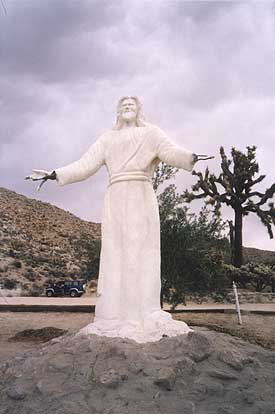 its glory (Aug 2002), Yucca Valley, California. Created in the 1950s by sculptor Antone Martin out of conrete, , Desert Christ Park is situated on a desert hillside overlooking the town of Yucca Valley. Many of the figures were badly damaged after the 7.3 Landers earthquake in 1992. 35 other figures fill the park, depicting various scenes from The Bible. Hwy 62, left onto Mohawk Trail. At Sunny Slope Drive, adjacent to the Evangelical Free Church. 57090 Twenty-Nine Palms Hwy.