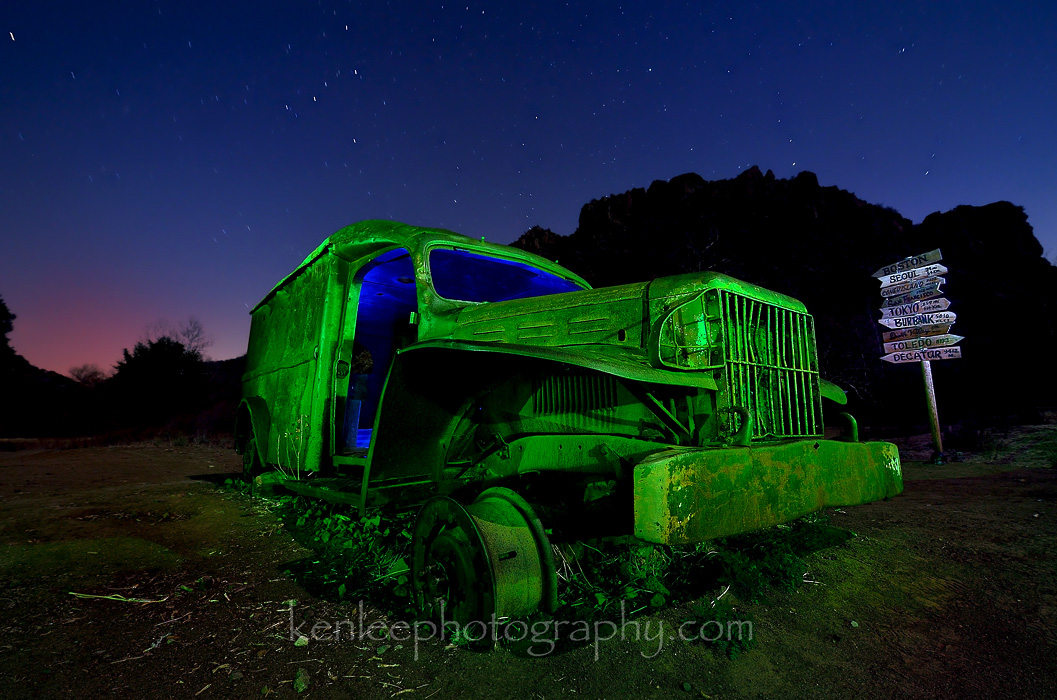 I went a bit too extreme with the green light, but it's a fun shot nonetheless. Next time, I'll probably not paint the tires green so much. :DPhotography: Ken Lee Info: Nikon D7000, Tokina 11-16mm f/2.8 lens, Feisol tripod. 143 second exposure at f/8 ISO 200 at 12:51 am 21 December 2013. Light painted with LED flashlights, a speedlight, and gels. Location: Agoura Hills, California, USA |