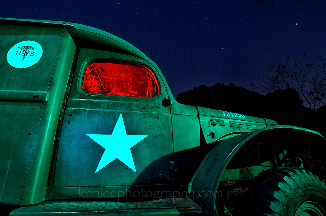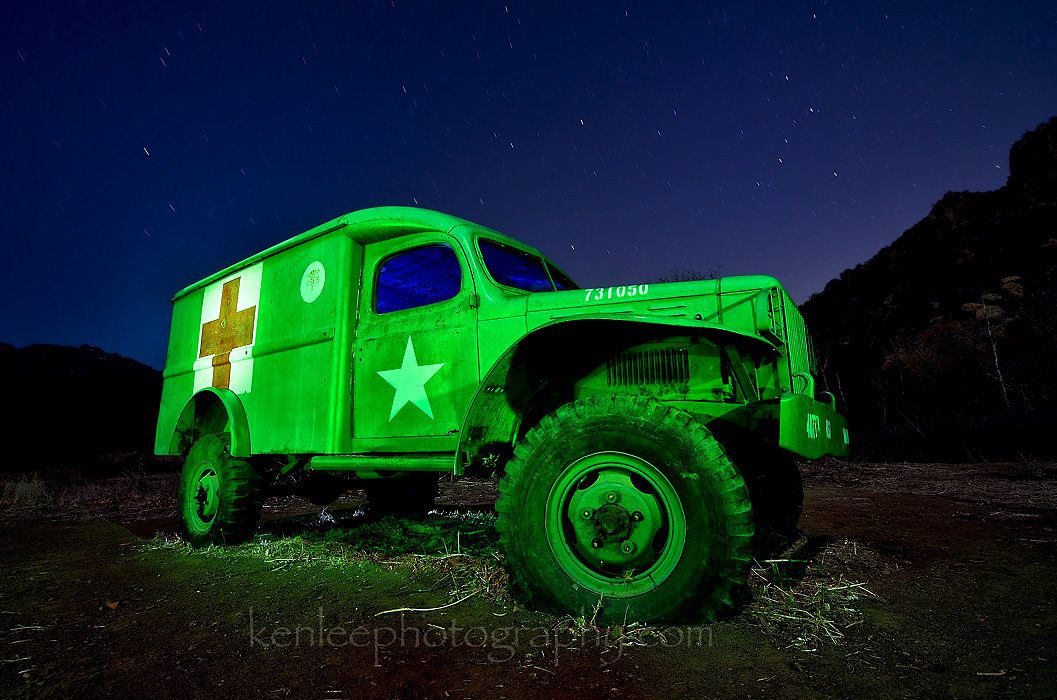 For this one, I went really over the top with the light painting, highlighting the red cross and star and tires. I had fun doing this, and I like the demented haunted feel that this photo has.Title: Haunted Ambulance Photography: Ken Lee Info: Nikon D7000, Tokina 11-16mm f/2.8 lens, Feisol tripod. 391 second exposure at f/8 ISO 200 at 3:43 am 21 December 2013. Light painted with LED flashlights, a speedlight, and gels. Location: Agoura Hills, California, USA |