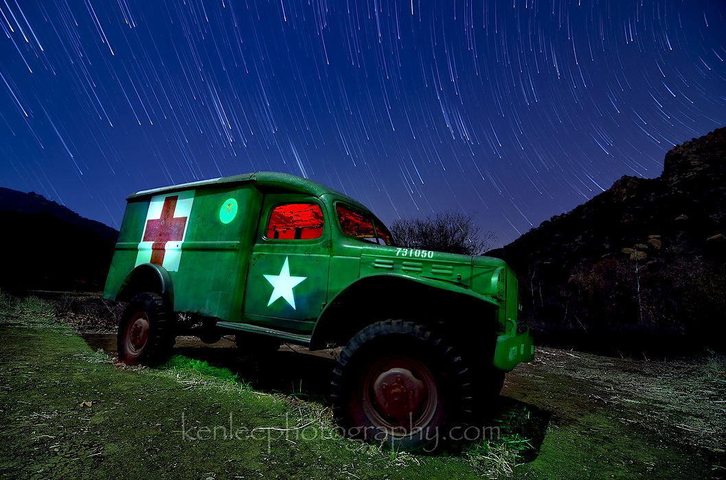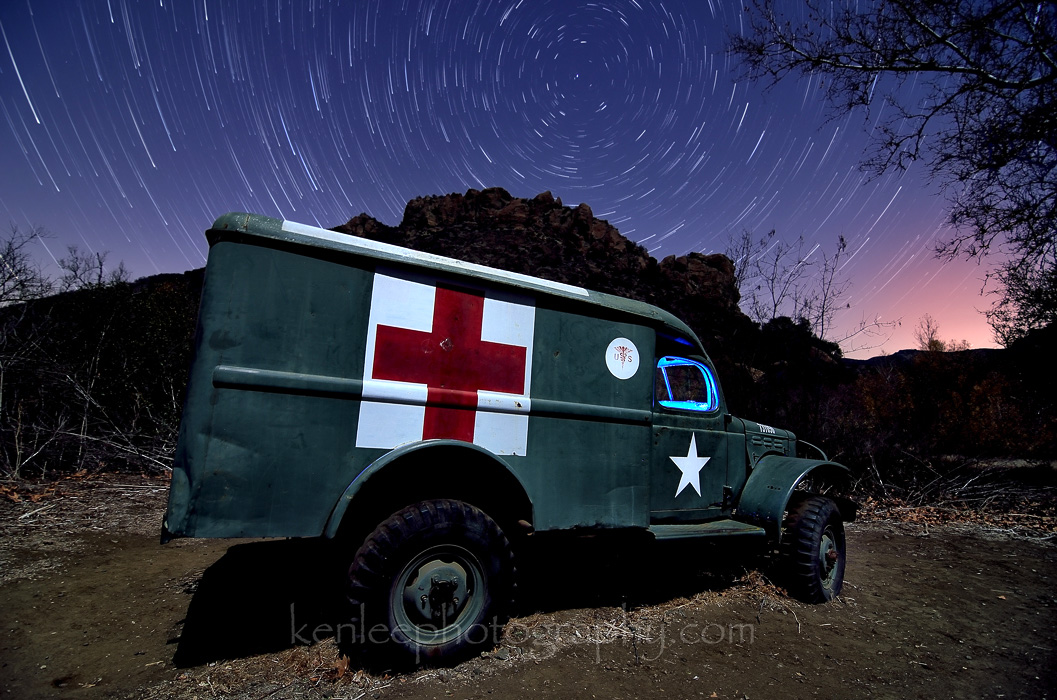 A long exposure photo with light painting, showing the celestial movement of the heavens at the site where the TV show M*A*S*H was filmed.Despite thermals and wool socks, I felt cold. Instead of laying on my back and looking at the stars or wandering around, I kept warm part of the time by running back and forth between the abandoned ambulances as the camera clicked away. Title: Hawkeye Star Trails Photographer: Ken Lee Info: Nikon D7000, Tokina 11-16mm f/2.8, Feisol tripod. This is a long exposure night sky photo of 30 and a half minutes in total, with each individual photo exposed for 30 seconds at f/4 ISO 400 and stacked "by hand" in CS4. Light painted with Streamlight LED flashlight and speedlight. Begun 2:36 am D.S.T. on 21 December 2013. Location: Agoura Hills, California, USA |