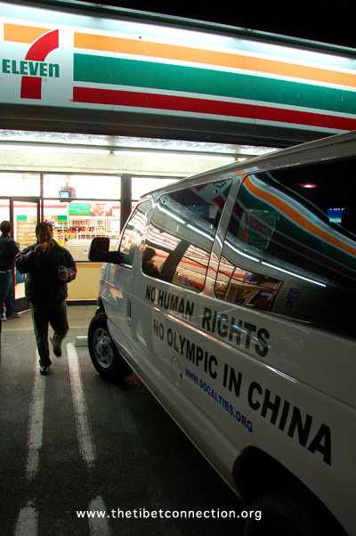 April 2008To try and get up to UN Plaza in San Francisco in time for the various rallies on the first day, we left absurdly early in the morning. All of us had gotten either no or very little sleep, and as the van rolled down The Grapevine, I saw the awkwardly positioned heads of the passengers bouncing along uncomfortably while one of the Tibetan gentlemen (photo below) gently murmured mantras. This sound was to become my favorite sound on the trip, a beautiful contrast to the loud bullhorns and chanting up north. The vans were organized by the Tibetan Organization of Southern California (TASC) to carpool up north. |