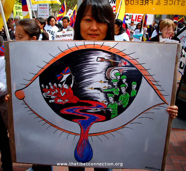 Tibetan with a sign depicting the tears and blood of China's crackdown. |