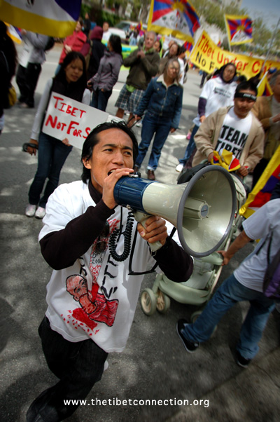 addresses the supporters in front of the Chinese Consulate."This is not about disrupting the torchbearers. This is about China using the torch for political purposes and we using it right back," Lhadon Tethong, executive director of Students for a Free Tibet (not pictured here) announced through a bullhorn. |