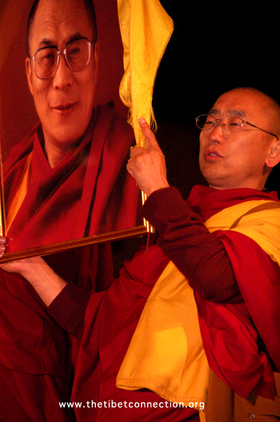 address the crowd while holding up a small thangka of the Dalai Lama. |