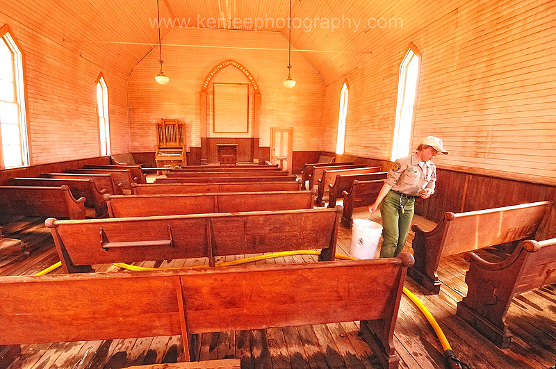 That said, much of Bodie is original, and is maintained and washed, as is the case here, where this ranger washes the interior of the Methodist church while singing church hymns in quite a beautiful voice. Later that day, there would be a wedding rehearsal, something that probably costs quite a bit of money. |