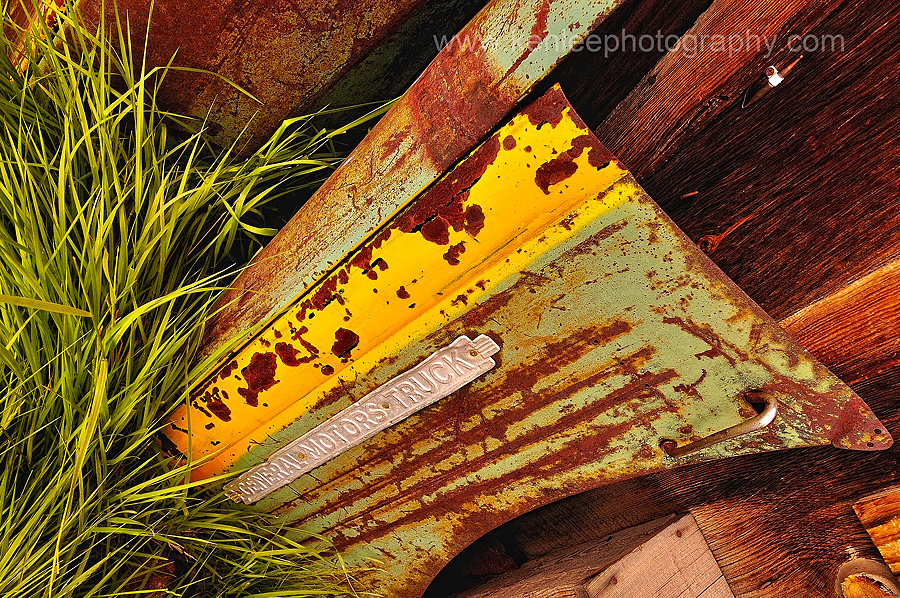 Part from a GM truck left to rot, leaning against the side of a building, showing that things can be quite beautiful and colorful in their decay. |