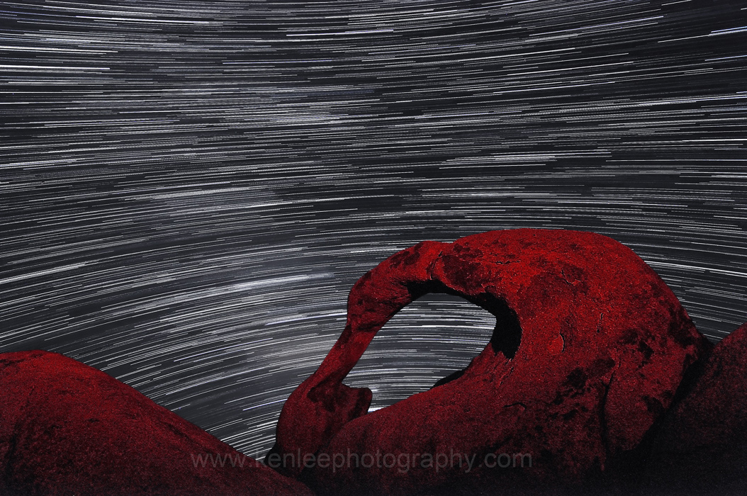 Title: Mobius Arch South Star Trails Another star trails photo, also stacked, a 50-minute total exposure. You can see the curvature of the Northern and Southern Hemisphere in this photo, which was taken while facing south.