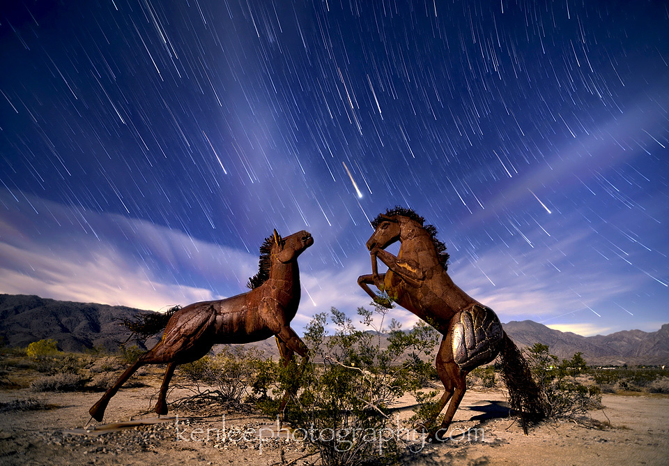 Title: Dos Caballos Star TrailsInfo: Nikon D7000, Tokina 11-16mm f/2.8, Feisol tripod. Night sky long exposure. Sculptures by Ricardo Breceda. The star trails photo is 27 minutes in total, stacked, each of the 54 individual images is a 30 second exposure at f/2.8 ISO 400. The horses are naturally lit by the moon. 19 March 2014, begun at approximately 11:52 pm. Photo: Ken Lee Photography Location: Borrego Springs, California, USA ~~~ Título: Dos Caballos Star Trails Info: Nikon D7000, Tokina 11-16mm f/2.8, Feisol trípode. Larga exposición cielo nocturno. Esculturas de Ricardo Breceda. Usando largas exposiciones capturar el movimiento de las estrellas, 27 minutos en total (apilamiento de 54 imágenes, 30 segundos de exposicion, f/2.8 ISO 400,en Photoshop CS4). Los caballos son iluminado naturalmente por la luna. 19 de marzo 2014 a las 23:52. Foto: Ken Lee Photography Ubicación: Borrego Springs, California, EE.UU. |