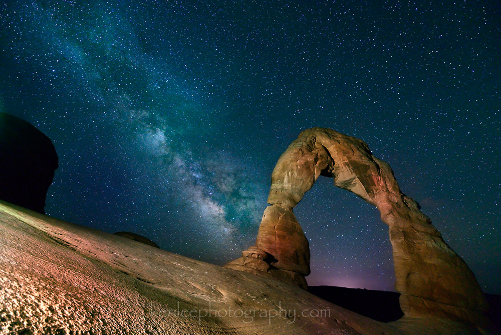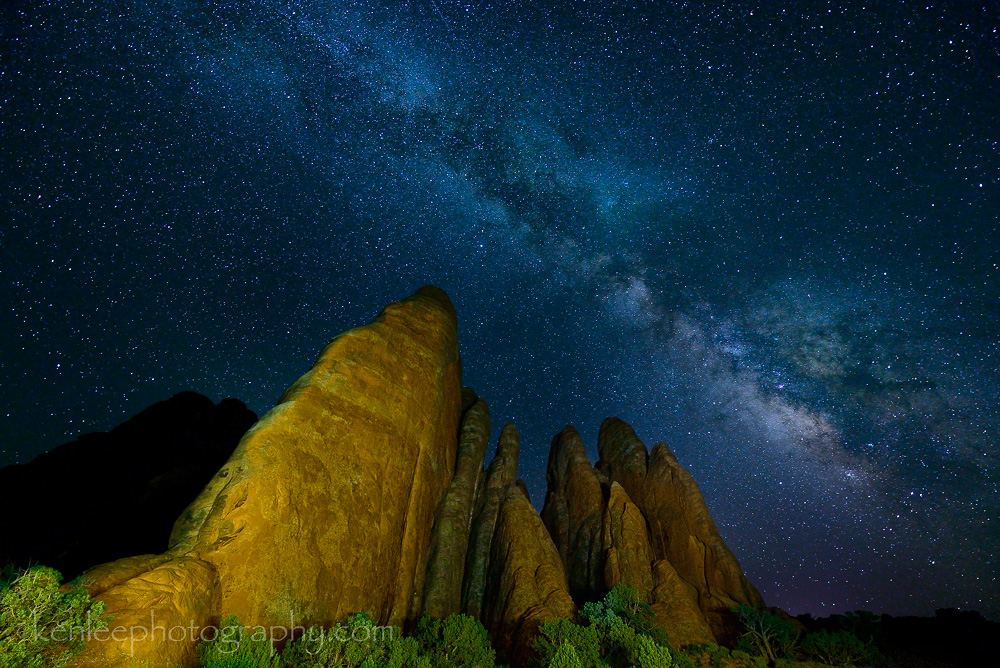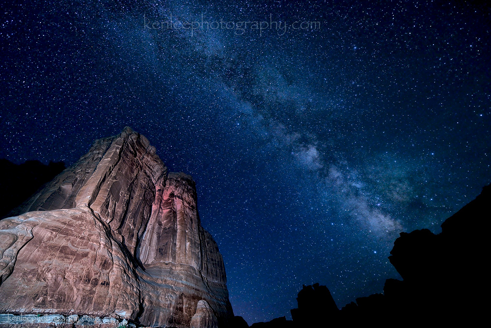 Gazing up at Delicate Arch feels like peering into the infinite beyond, the magnificent arch acting as a portal for the center of our galaxy and beyond. For this photo, I waited a bit for the Milky Way to drift farther south, then lined it up underneath the arch for this image. I light painted the arch with a small Streamlight LED flashlight to keep the arch from going to silhouette. The Milky Way is easy to see on a moonless night such as this one.Title: Door to Infinity Photo: Ken Lee Photography Info: Nikon D610, AF-S Nikkor 14-24mm f/2.8G ED lens at 14mm, 20 seconds, f/2.8, ISO 4000, 2014-06-25 12:37 am. Light painted with Streamlight LED flashlight. Location: Arches National Park, Utah, USA Título: Door to Infinity Foto: Ken Lee Photography Info: Nikon D610, AF-S Nikkor 14-24mm f/2.8G ED en 14 mm, de 20 segundos, f/2.8, ISO 4000, 2014-06-25 12:37 am. Pintura de luz con Streamlight linterna LED. Lugar: Arches National Park, Utah, EE.UU. #archesnationalpark #milkyway #stars #night #nature #astrophotography #arches #nikon #d610 #lightpainting #14-24mm #longexposure #kenlee #nationalgeographic #smithsonian #delicatearch |
