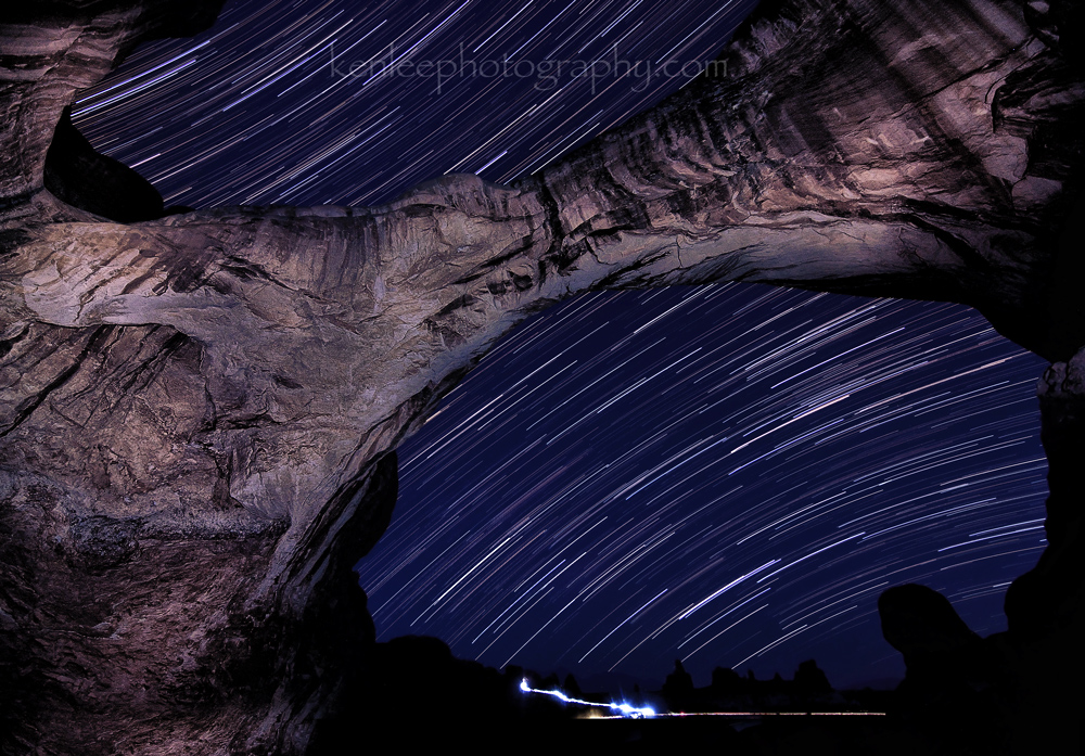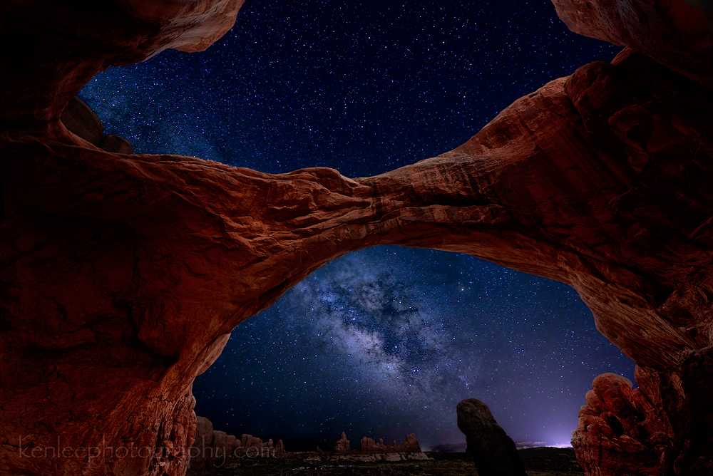 Feeling like an explorer on a new world in Arches National Park, Utah, watching the Milky Way drift toward the south as night progresses. The odd rocky formations in the distance are the rocks near the Windows Arches and Turret Arch. You can see the headlight trail of a car leaving this area. As you can see, the archway is enormous, extending up approximately 104 feet (31 m), with a span of 148 feet (45 m).Title: Our New World Photo: Ken Lee Photography Info: Nikon D610, AF-S Nikkor 14-24mm f/2.8G ED lens at 14mm, 20 seconds, f/2.8, ISO 4000, 2014-06-23 11:48 pm; blended with an earlier photo with me standing in the front 13 seconds, ISO 400, f/4, taken 9:26 pm that same day. Light painted with Dorcy LED flashlight and Energizer head lamp. Location: Arches National Park, Utah, USA Título: Our New World Foto: Ken Lee Photography Info: Nikon D610, AF-S Nikkor 14-24mm f/2.8G ED en 14 mm, de 20 segundos, f/2.8, ISO 4000,23/06/2014 23:48; mezclado con una foto con conmigo de pie en la parte delantera, 13 segundos, ISO 400, f / 4, tomada a 21:26 del mismo día.. Luz pintada con Dorcy linterna y lámpara de cabeza Energizer LED. Lugar: Arches National Park, Utah, EE.UU. #archesnationalpark #milkyway #stars #night #nature #astrophotography #arches #nikon #d610 #lightpainting #14-24mm #longexposure #kenlee #nationalgeographic #smithsonian #doublearch |