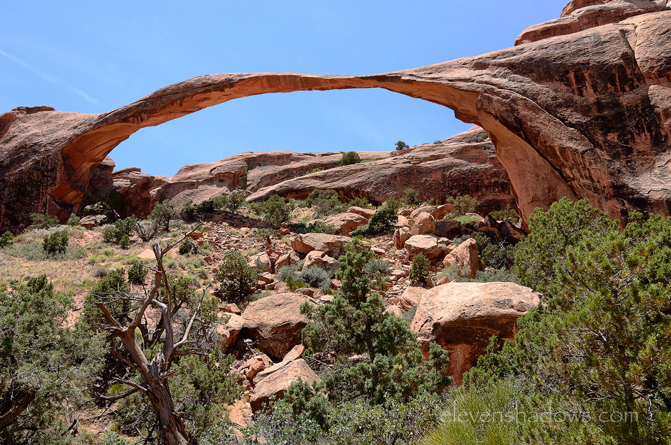 Landscape Arch is in the Devils Garden section of Arches National Park. In its thinnest section the arch is only 6 feet thick, yet it supports a span of rock 290 feet long, looking extremely frail, as if it could collapse at any point. And in 1991, it did just that, a 73-foot slab of rock fell out from underneath the thinnest section of the span. A Swiss tourist caught it on video. On June 5, 1995, a 47-foot mass of rock fell from the front of the thinnest section of the arch, followed by another 30-foot rock fall on June 21. Due to these events the Park Service has closed the loop trail that once led underneath the arch. Devils Garden contains the the largest concentration of significant natural arches in the world. Past Landscape Arch is the Double O Arch, a 5-mile round trip, and there are other arches, including Tunnel, Pine Tree, Landscape, Wall, Partition, and Navajo, as well as Double O. |