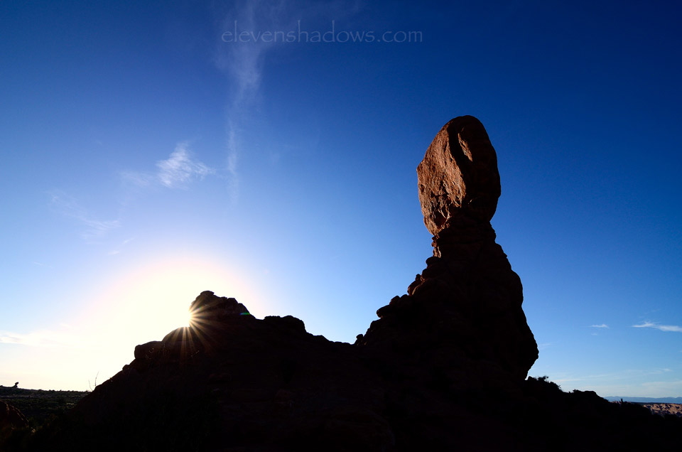 Sunset at Balanced Rock, bathed in the rays of the setting sun. |