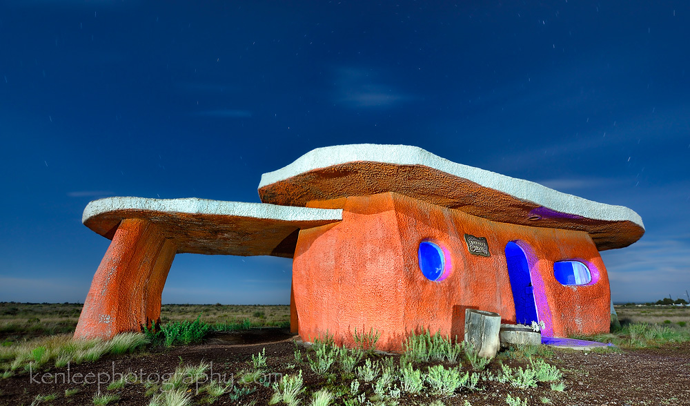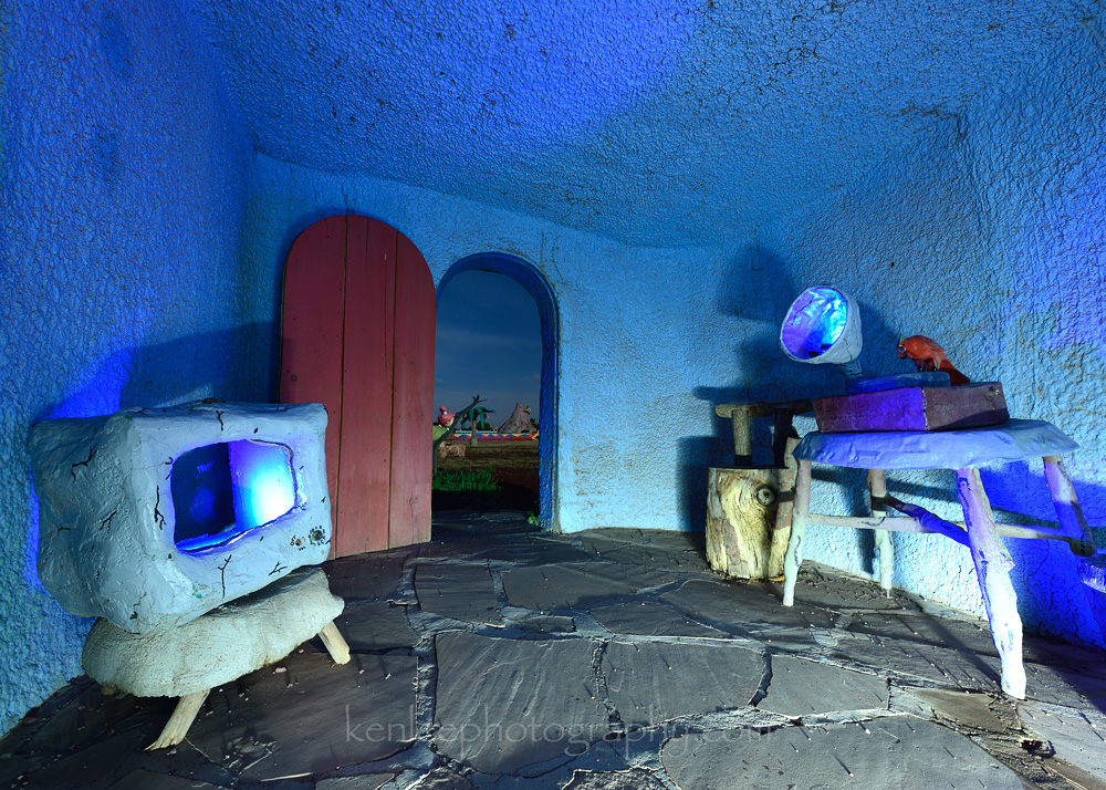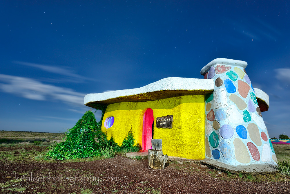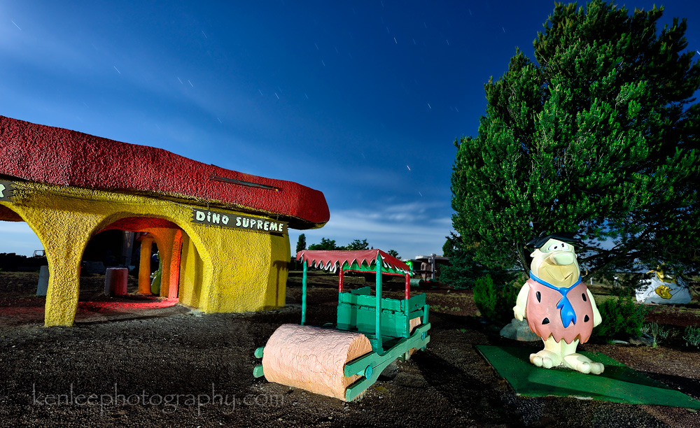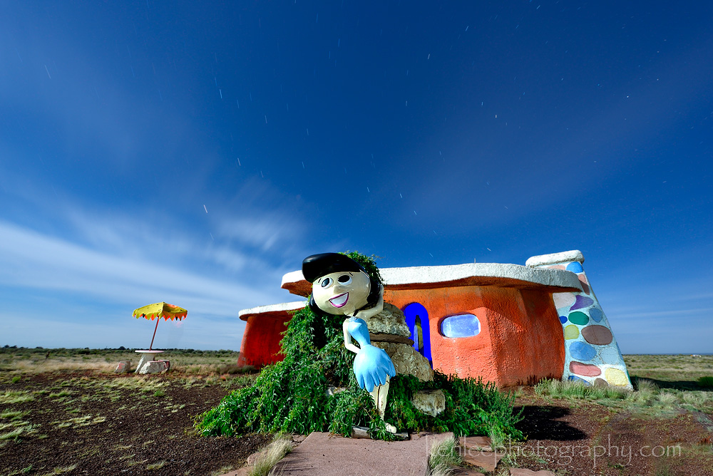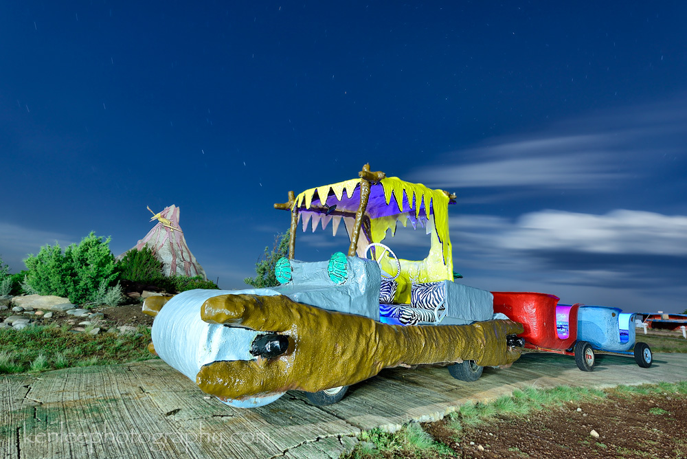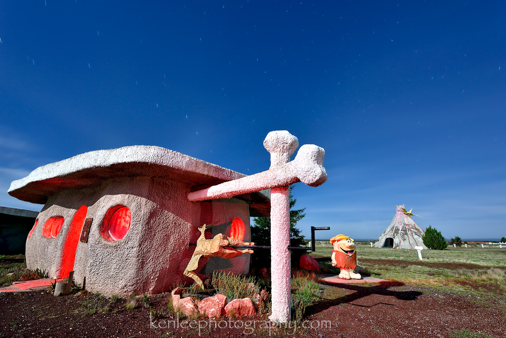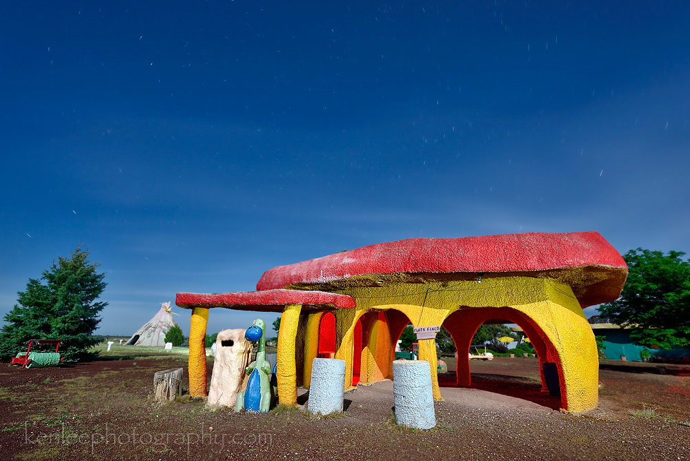 Bedrock City, Arizona, located on the way to the Grand Canyon. This is a long exposure night photo. I use a tripod to keep the camera still, and then leave the shutter open for a long period of time. All the illumination and colored lights are done while the camera shutter is open. I illuminate the structure as well as the interior. This sort of long exposure photography is almost like a performance, and is extremely fun, and rather addicting to do. The streaks in the sky are the stars appearing to move. This is due to the rotation of the earth while the camera shutter is open. |