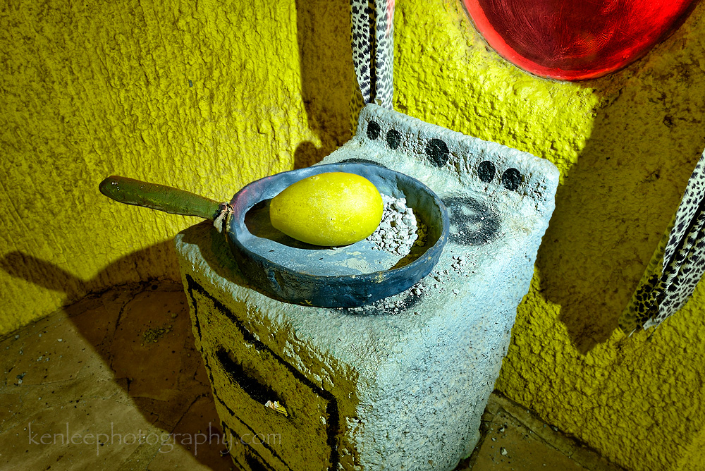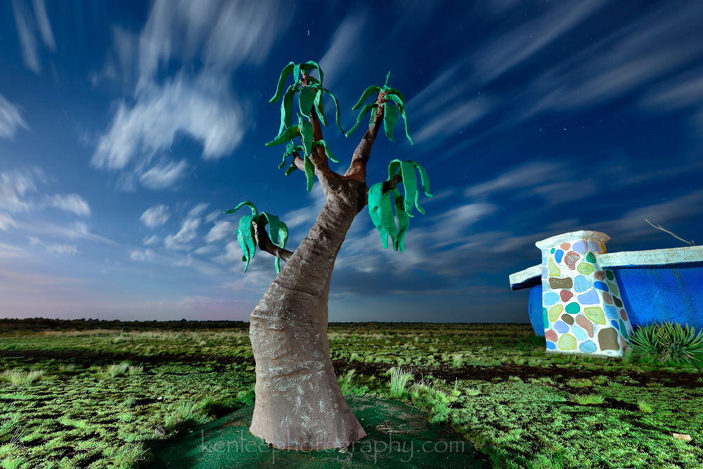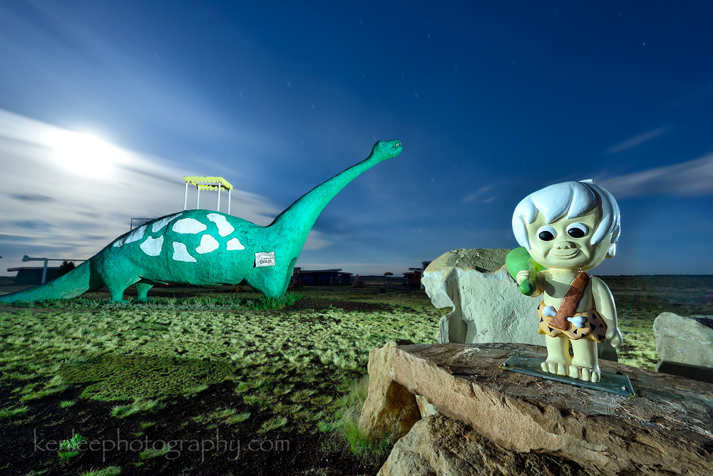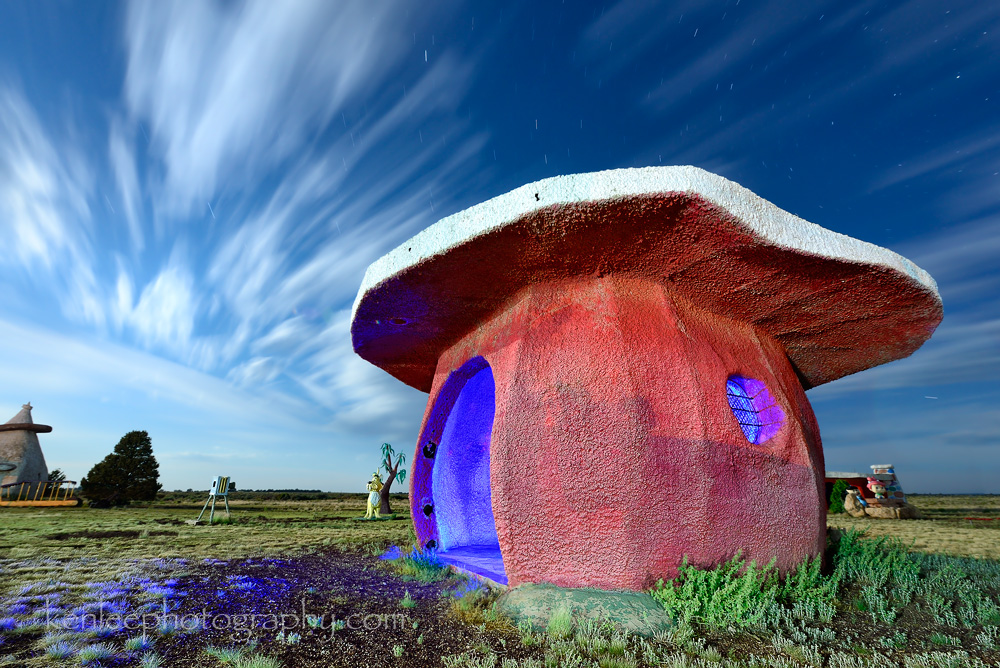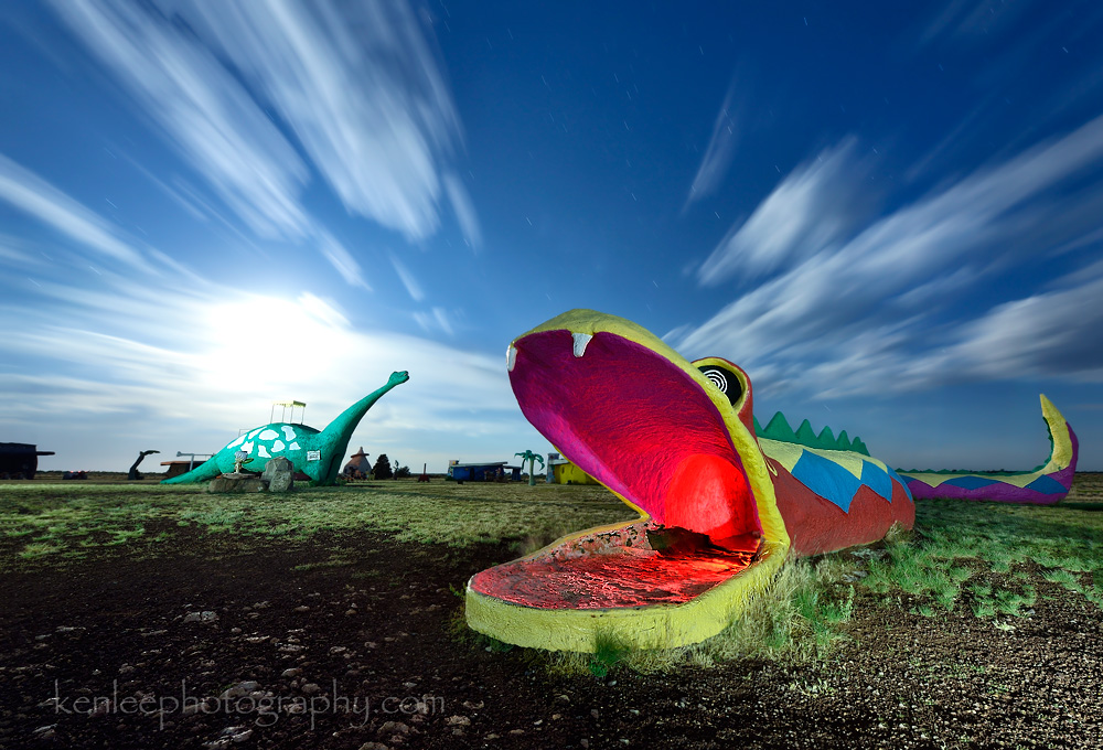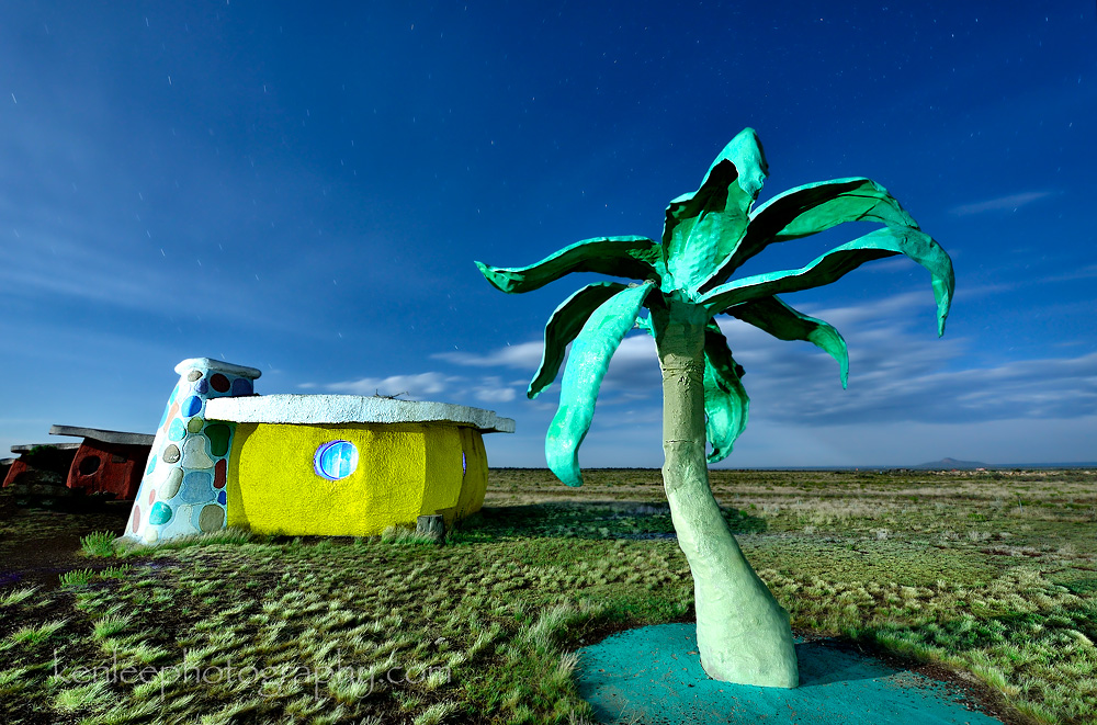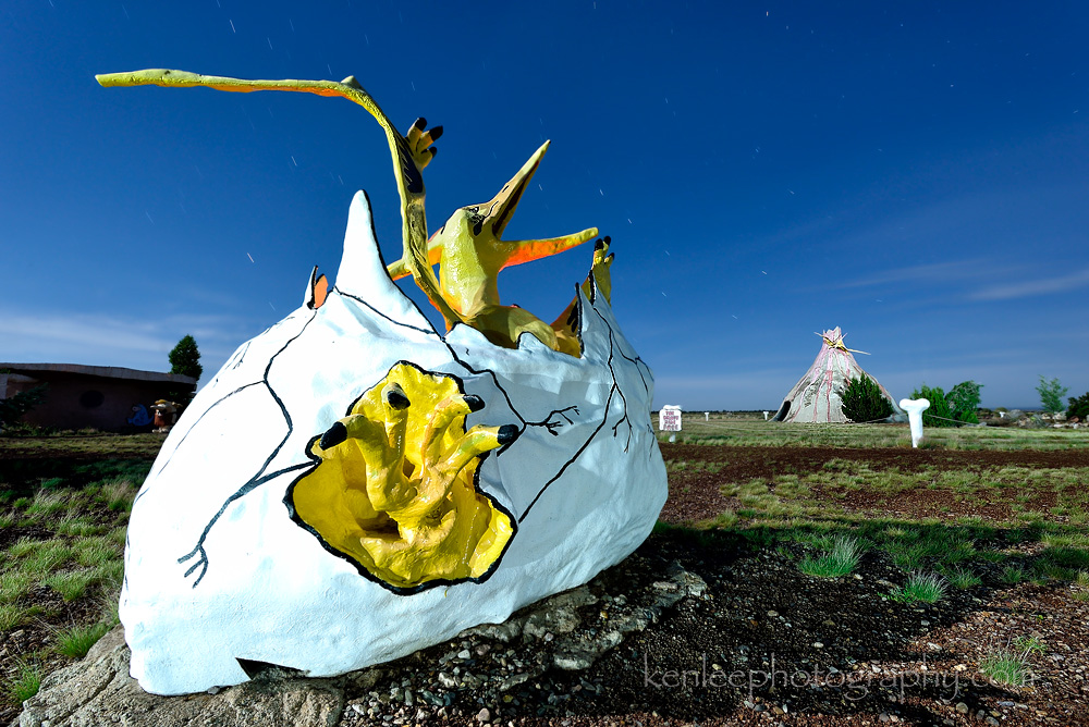 Bedrock City, Arizona, located on the way to the Grand Canyon. This is a long exposure night photo. I use a tripod to keep the camera still, and then leave the shutter open for a long period of time. All the illumination and colored lights are done while the camera shutter is open. I illuminate the structure as well as the interior. This sort of long exposure photography is almost like a performance, and is extremely fun, and rather addicting to do. The streaks in the sky are the stars appearing to move. This is due to the rotation of the earth while the camera shutter is open. |