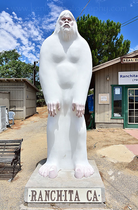 Along Montezuma Valley Road, a dramatic windy road ascending up from from Borrego Springs to Route 79, I had to stop in the Ranchita Country Store to get a Gatorade and find out about Bigfoot, a giant 11-foot white statue standing outside. "So there are Bigfoot sightings this far south now?" I asked, joking. "There have been starting three years ago!" the store clerk replied, pointing out at the enormous white statue. "His name is Rancheti Yeti". Realtor Joe Rauh named him that. And why not? He built the 300-pound fiberglass wonder, having extra time during the housing slump. Good things do come out of crushing recessions after all. I never found out why Bigfoot had a pink face and hands, though. Gatorade in hand, I hit the road. Shortly after getting on Route 79, I hopped on Route 76, driving this winding mountain road all the way to Interstate 5. Route 76 is a beautiful drive, with gorgeous mountains, streams, lakes, and farmland. I even saw a sign for river rafting at the La Jolla Indian Reservation campground |