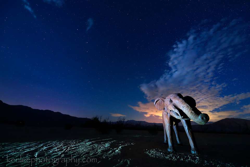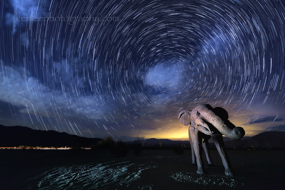 The clouds hung in the sky for quite some time, breaking up the star trails, but it was a lot of fun to create this star trails nonetheless. I set up the shot for this camera, letting it shoot for fifty minutes continuously while I helped participants taking my Star Trails and Light Painting Workshop over the July 4th holiday weekend. We had some very slow moving clouds this evening, and I thought the elephant would look really great backlit by some of the clouds.Title: Sky Elephant Star Trails Photo: Ken Lee Photography Info: Nikon D610, AF-S Nikkor 14-24mm f/2.8G ED lens at 14mm. This is created from stacked photos, 50 minutes total. Each photo is 30 seconds, f/2.8, ISO 640. Star trails begun 2014-07-06 12:26 am. Light painted with LED flashlight. Location: Borrego Springs, CA, USA Título: Sky Elephant Star Trails Foto: Ken Lee Photography Info: Nikon D610, AF-S Nikkor 14-24mm f/2.8G ED en 14mm. Esta se crea a partir de fotos apiladas, 50 minutos total. Cada foto es de 30 segundos, f/2.8, ISO 640. Rastros de la estrella empezaron 06/07/2014 12:26a.m.. Luz pintada con la linterna LED. Ubicación: Borrego Springs, CA, EE.UU. #stars #borregosprings #ricardobreceda #elephant #sculpture #nikon #d610 #lightpainting #nightsky #photography #california #desert #startrails |