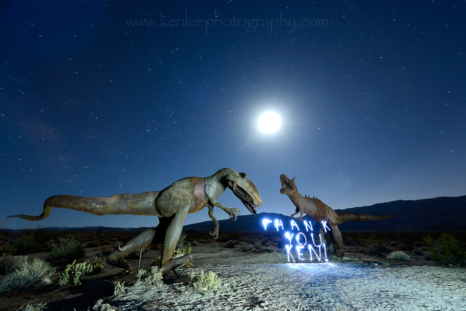 I taught a really really fun 2-day Star Trails and Light Painting Workshop over the weekend. The participants were wonderful. One of them, Marcie, wrote a lovely thank you for the workshop, which I greatly appreciate!!! The sculptures are created by artist Ricardo Breceda. The moon is a 65% moon that set well after midnight on this evening.Title: Carnosaurus Thank You Photo: Ken Lee Photography Info: Nikon D610, AF-S Nikkor 14-24mm f/2.8G ED lens at 14mm, 79 seconds, f/5.6, ISO 800, 2014-07-06 11:02 pm. Dinosaurs illuminated with LED flashlight. Light writing with an LED flashlight by Marcie Gold. Location: Borrego Springs, CA, USA ~~~~~~~~ Mis estudiantes me dio las gracias por mi taller de fotografía. Título: Carnosaurus Gracias Foto: Ken Lee Photography Info: Nikon D610, AF-S Nikkor 14-24mm f/2.8G ED en 14 mm, 79 segundos, f/5.6, ISO 800, 07/06/2014 23:02. Dinosaurios iluminadas con una linterna LED. La escritura de luz con una linterna LED por Marcie Gold. Ubicación: Borrego Springs, CA, EE.UU. #stars #borregosprings #ricardobreceda #dinosaur #sculpture #nikon #d610 #lightpainting #nightsky #photography #california #desert #moon |