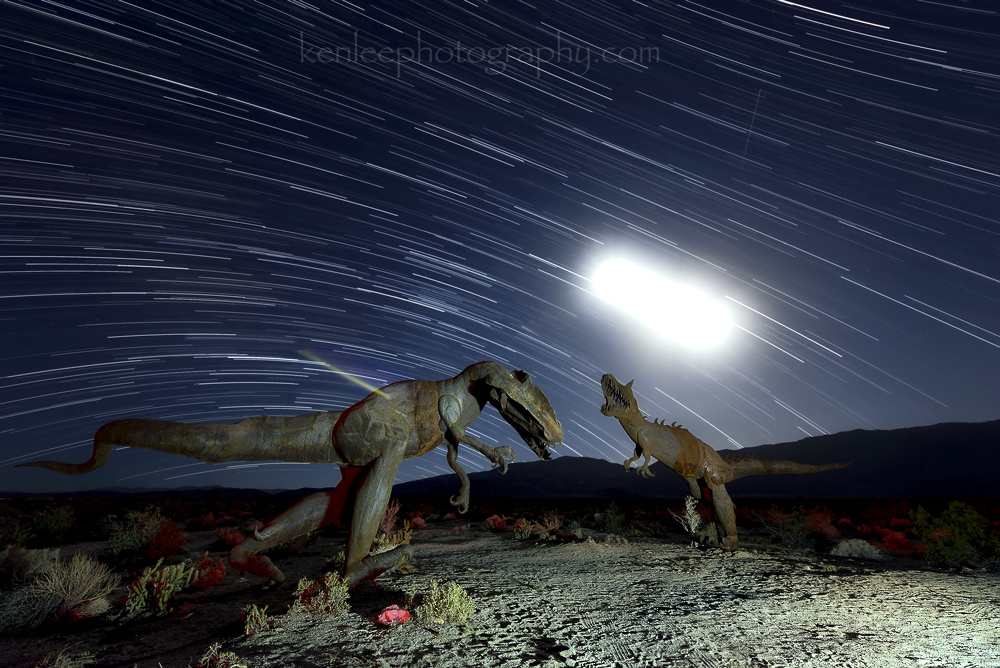 This is a long single exposure photo of 380 minutes showing the celestial movements of the stars above two dinosaurs locked in combat. The dinosaur sculptures are created by Ricardo Breceda. You can see the Milk Way, blurred by the 380 second exposure, along with the trailing of the stars.Title: The Heat of Battle Photo: Ken Lee Photography Info: Nikon D610, AF-S Nikkor 14-24mm f/2.8G ED lens at 14mm, 380 seconds, f/5.6, ISO 800, 2014-07-07 2:20 am. Light painted with LED flashlight. Location: Borrego Springs, CA, USA ~~~~~~ Título: The Heat of Battle Foto: Ken Lee Photography Info: Nikon D610, AF-S Nikkor 14-24mm f/2.8G ED en 14mm, 380 segundos, f/5.6, ISO 800, 07/07/2014 02:20 am. Luz pintada con la linterna LED. Ubicación: Borrego Springs, CA, EE.UU. #stars #borregosprings #ricardobreceda #dinosaur #sculpture #nikon #d610 #lightpainting #nightsky #photography #california #desert #moon #startrails |