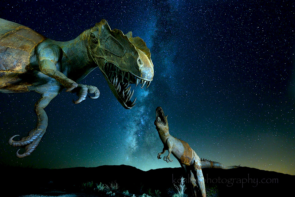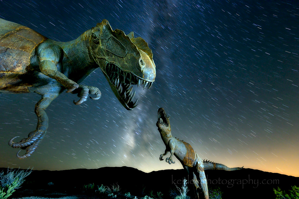 A Carnosaurus and Allosaurus locked in a combat that shakes the stars above. These sculptures, among my favorite in Borrego Springs, are created by Ricardo Breceda. This photo is blended from two photos. The Milky Way is visible, as the camera is facing south.Title: Battle of the Galactic Dinosaurs Photo: Ken Lee Photography Info: Nikon D610, AF-S Nikkor 14-24mm f/2.8G ED lens at 14mm. Two photos are blended. One is for the light painting: 380 seconds, f/5.6, ISO 800. The second is exposed for the Milky Way: 20 seconds, f/2.8, ISO 4000. 2014-07-07 2:34 am. Light painted with LED flashlight. Location: Borrego Springs, CA, USA Título: La batalla de los Galácticos Dinosaurios Foto: Ken Lee Photography Info: Nikon D610, AF-S Nikkor 14-24mm f/2.8G ED en 14mm. Dos fotos en sí mezclan. Uno es para la pintura de luz:. 380 Segundos, f/5.6, ISO 800. La segunda foto expone durante la vía láctea:. 20 Segundos, f/2.8, ISO 4000 07/07/2014 02:34 am. Luz Pintada Con La linterna LED. Ubicación: Borrego Springs, CA, EE.UU. #stars #borregosprings #ricardobreceda #dinosaur #sculpture #nikon #d610 #lightpainting #nightsky #photography #california #desert #moon #milkyway |