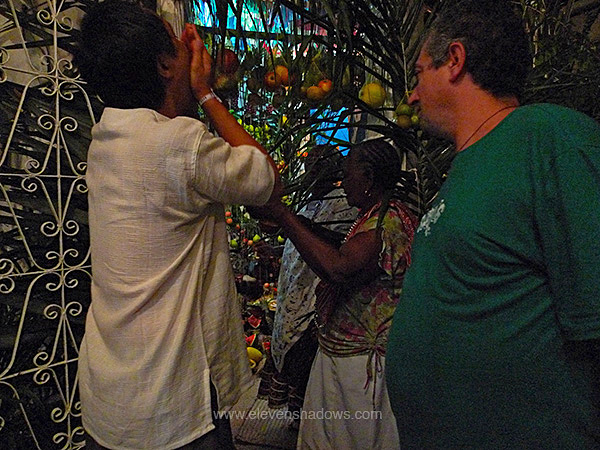 pink and white ribbons at the top.After the dancing, everyone went outside to a shrine. The priestess gave drinks of wine in bowls of gourd. The initiates who went inside received an orisha from above, and now possessed, occasionally shook violently, sometimes emitting noises. Eventually, they emerged from the shrine in an altered state, sometimes seeming like they might fall. Everyone walked back inside. The drummers started up. The women danced again. The possessed initiates lit cigars from a ceremonial candle and danced in trance, sometimes dancing frenetically, other times walking about slowly. Some priestesses began hugging those of us on the periphery. |