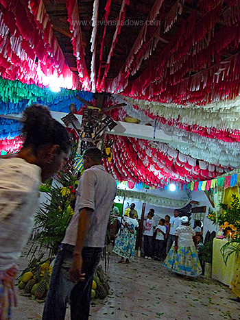 the middle pole with festooned with a dark wooden orixa (orisha), fruit, and