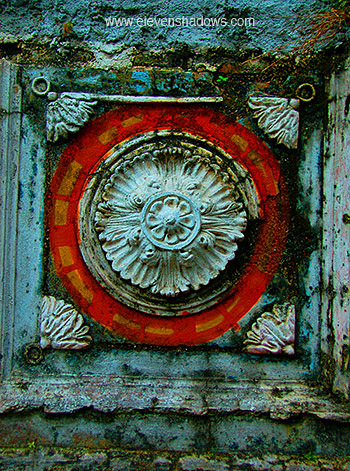 on the wall of a decaying old colonial house. |