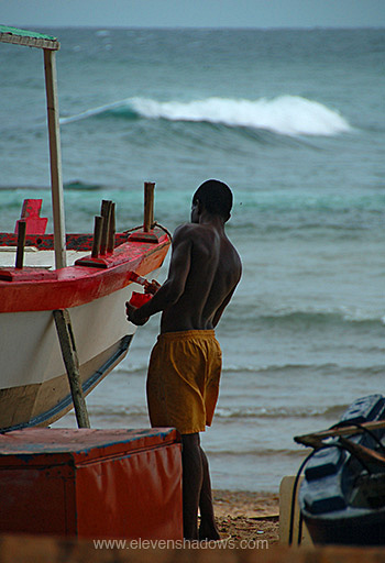 deep-hued, and wanted to photograph some of them and walk along the beach.I exited the bus randomly, and walked quite a ways over to an expensive hotel to see the views, then walked back out to Avenida Presidente Vargas, paralleling the beach, walking back towards Ondina. Along the way were several coves filled with fishermen, some painting their boats. Although most of the time, I had been photographing things around Salvador with my small Leica camera, today I had chosen to bring the larger camera to use the zoom. I had asked about how safe it was to walk along the beach. "It's safe," people had said. "It's daylight, and it's busy." |