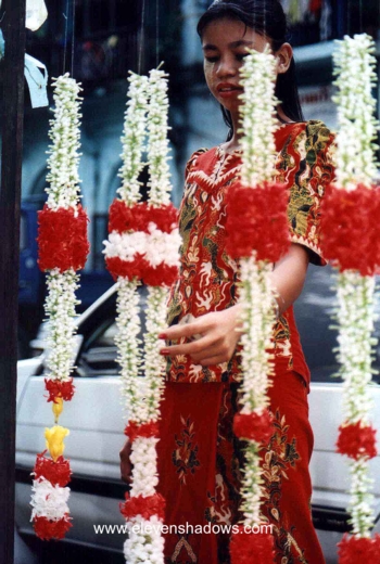 a Hindu temple in Yangon, Myanmar, a girl sells garlands to be given as
