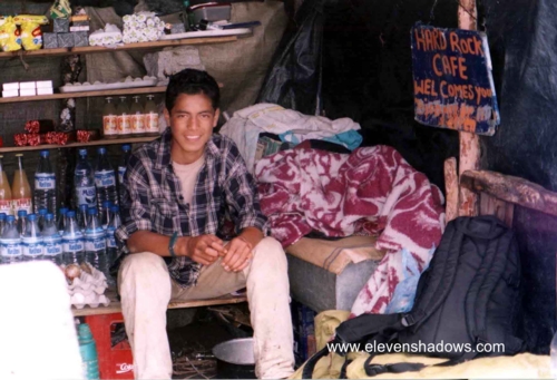 As we huddled beneath the eaves, cold and soaking, Jeeteivdar Kumar appeared, seemingly out of nowhere, and spoke five beautiful words: "Do you want hot chai?" He led us further up the summit to the Hard Rock Café Triund, a crude ramshackle structure of logs, corrugated metal, and blue tarp, and we enjoyed some hot chai, just as promised. Jeeteivdar lives in a cave nearby, walking down to Bhagsu two or three times a week to haul up cookies, Coke, bottled water, Ramen noodles, and other delicacies for the Hard Rock Café Triund. If only he sold t-shirts.