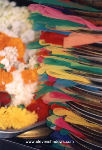 Colorful scarves and flowers for offering at Lak
