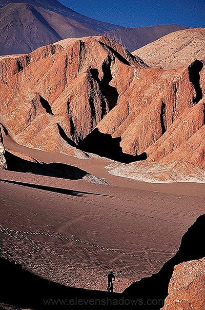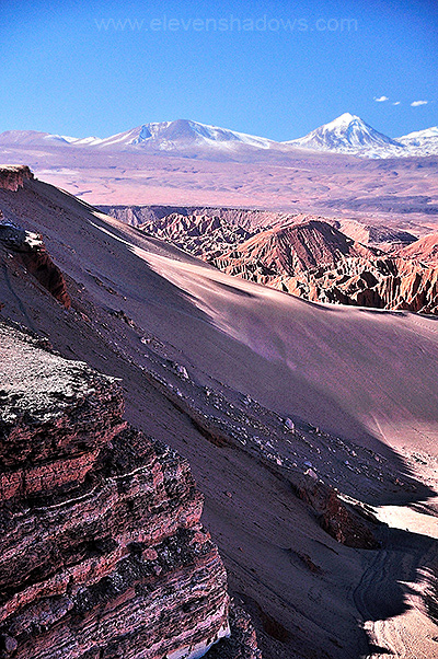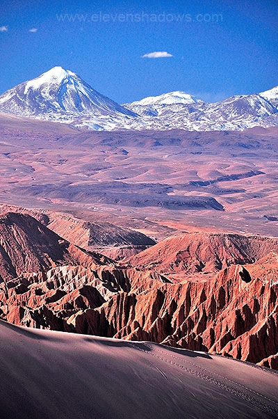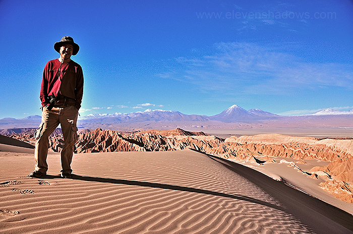 Me on one of the dunes at Valle de la Muerte, with Licanbabur Volcano and the snow-capped Andes mountain range, and beyond that, Bolivia in the distance. The closer mountains are part of the Cordillera de Sal, made largely of salt, and just behind beyond that, the little pueblo of San Pedro de Atacama, population 5000. |