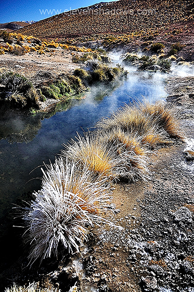El Tatio is the third largest geyser field in the world, after Yellowstone National Park in Wyoming and the Valley of the Geysers in the Kamchatka Peninsula of Russia. What causes the steam? Magma heats underground rivers. The air from the geysers meets the freezing morning air and immediately condenses. None of the geysers shoot forth like the famous geyser at Yellowstone. These are more sedate, more eerie. |