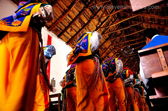 The procession for the fiesta moved inside the San Pedro church, built in 1744. You can see the rustic ceiling, made of cardon cactus slats and algarrobo beams with leather binding. |