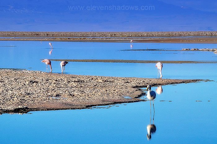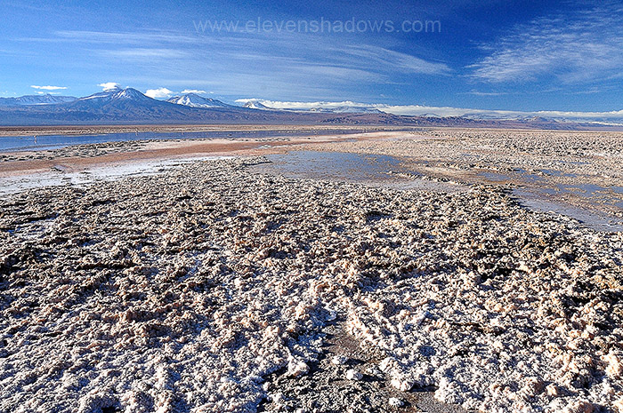 Laguna Chaxa sits next to very large salt plains, left from when the land was submerged underwater before earthquakes shoved the earth skyward into what is now the Andes Mountain range. Although it looks like muddy snow, it really is salt.This reminded me a lot of Death Valley in California, although the region in general reminded me of the salt plains that my cousin Simin and I visited near Arequipa in Peru. |