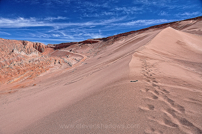 While trying to figure out where I could go and how to do it at the bus company, I had seen a restaurant advertising beef stroganoff, one of my favorite dishes, and Chilean wine. After my frustrating day of dead-ends, this sounded like a positive thing to do. And to add to it, I ended up eating with three Australian women who I had met earlier in the day dudring their similar attempts to flee. Two were teachers. They just simply had quit work to travel. Nice. The wine was delicious. The beef stroganoff, not so much. It didn't resemble the dish and curiously came with potatoes, but no noodles. But no matter, a good evening. ~~~ 7 julio, jueves: After more attempts to go to Valparaiso, I rented a bike. This time, no intense wind, just a beautiful day. Perfect. The ride to Valle de la Muerte is an easy incline for only about 4-5km, a pleasant ride, riding up the dirt road of the Cordillera de Sal that leads to the valley. This felt great. I rode everywhere up the canyon of salt, walking around, sitting, eating, drinking, walking, riding. |