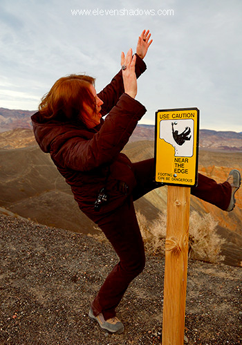 attempts to use caution near the edge of the Ubehebe Crater, Death Valley,