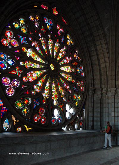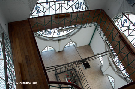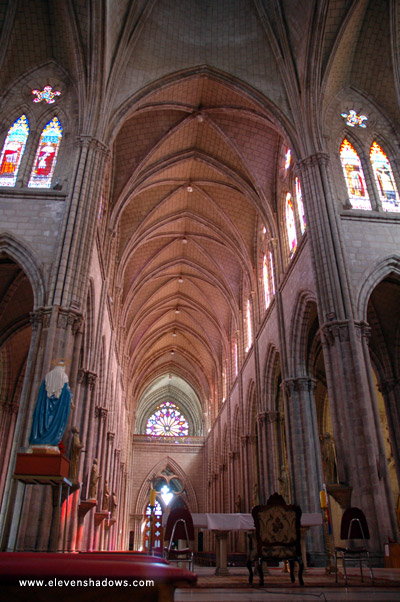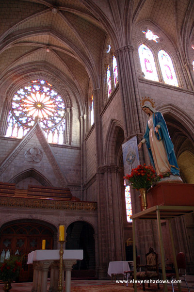 La Basílica in Quito. My first day in Quito, I vowed to take it easy, get used to the 2800m (nearly 10,000 ft.) elevation, and simply see a few churches in the Old Town (historical center) of Quito. Although I knew that that the clock towers were 78m tall, I was told that there was an elevator. No problem. But actually, the elevators only go up a few floors. The rest is by stairs, and later on, by crude rebar ladders. Whew. The view, however, was spectacular, as you will see a few pictures below. |