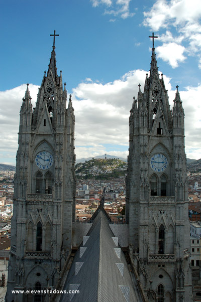 The 78m twin clock towers of La Basílica, Quito, bracketing the enormous 41m statue of La Virgen atop the Panecillo in the distance. |