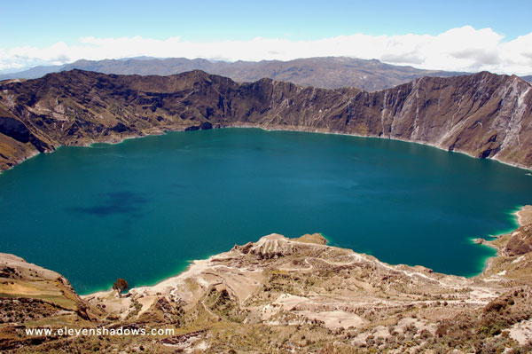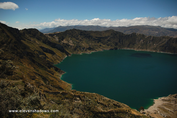 Having acclimatized somewhat in Quito, I took a bus to the Andean countryside west of Latacunga, first visiting to Laguna Quilotoa. This incredible crater lake has blue-green water and sandy shores...at 3500m (the rim is at 3854m, metric for "really freakin' high!"). It was extremely windy as well, and very beautiful. |