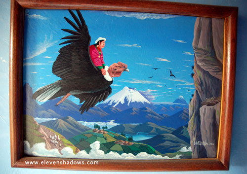 This is the picture hanging in my Hostal Llullu Llama room. It depicts an Andean tale of an Andean condor whisking away a woman. |