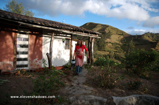 Katrien watering the vegetable garden at Hostal Llullu Llama in Isinlivi. |