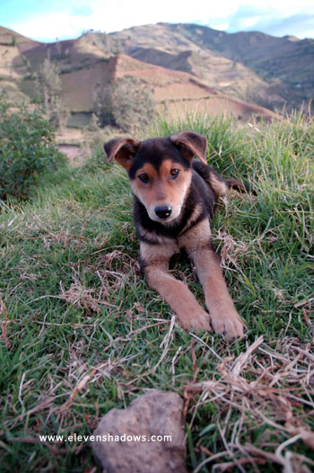 NIna the exuberant puppy. When I first got to the hostal, Nina leaped up and nipped at my tan pants, ripping them. I sewed them up. Field repair, crude but effective. |