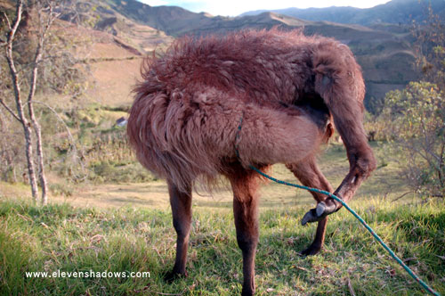 The strange and elusive headless llama, a rarity in the Andean highlands. I'll bet you've never seen one before. Remember, you saw it here on the Eleven Shadows web site and nowhere else. More pictures of llamas than you can handle on the Llu Llove Llamas, I Llove Llamas Page. |