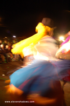 As part of a week-long celebration of Simón Bolívar liberating Cuenca from the grip of the Spanish, we saw a performance of Ecuadorian cultural dance at the Quinta Bolívar. I took many pictures of the dances from various parts of Ecuador, mostly clear pictures with my flash, but this picture resonates with me most in capturing the festivity and essence of the dances that evening. |