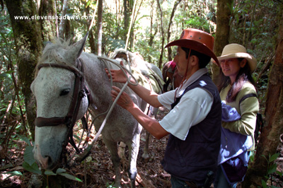 We rode uphill on rocky paths, crossing and recrossing streams, stopping off at a cabin at the top of a rise for some delicious tuna sandwiches made by the guide, shown here assisting Naomi. |